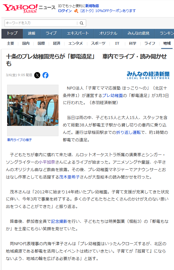 2026年3月3日に参加させて頂いた都電荒川線内のコンサートがYahoo Newsに掲載頂きました!